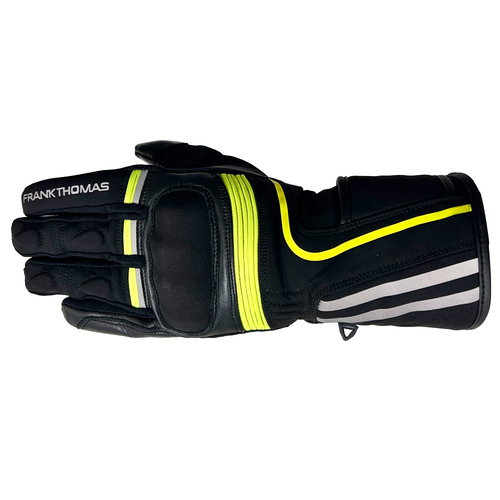 CE Certified Level 1 KP EN 13594:2017, the Frank Thomas Konya gloves feature knuckle protectors, palm sliders, and finger padding for added protection. The durable textile and leather construction features accordion panelling for optimum movement and comfort. The lining gives added comfort and warmth, and the longer styling offers added coverage to prevent weather ingress and these are waterproof. Adjustability at the cuff and wrist provides a perfect fit, and additional grip at the palm and fingers offers excellent feedback. Touchscreen compatibility with index fingers allows you to use technology without removing your glove. Reflective detailing maximises night visibility. Available in a choice of colours.
